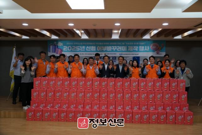 ![]() 제주도신협 두손모다봉사단이 어부바꾸러미 200개를 제작하여 전달식을 진행했다) |