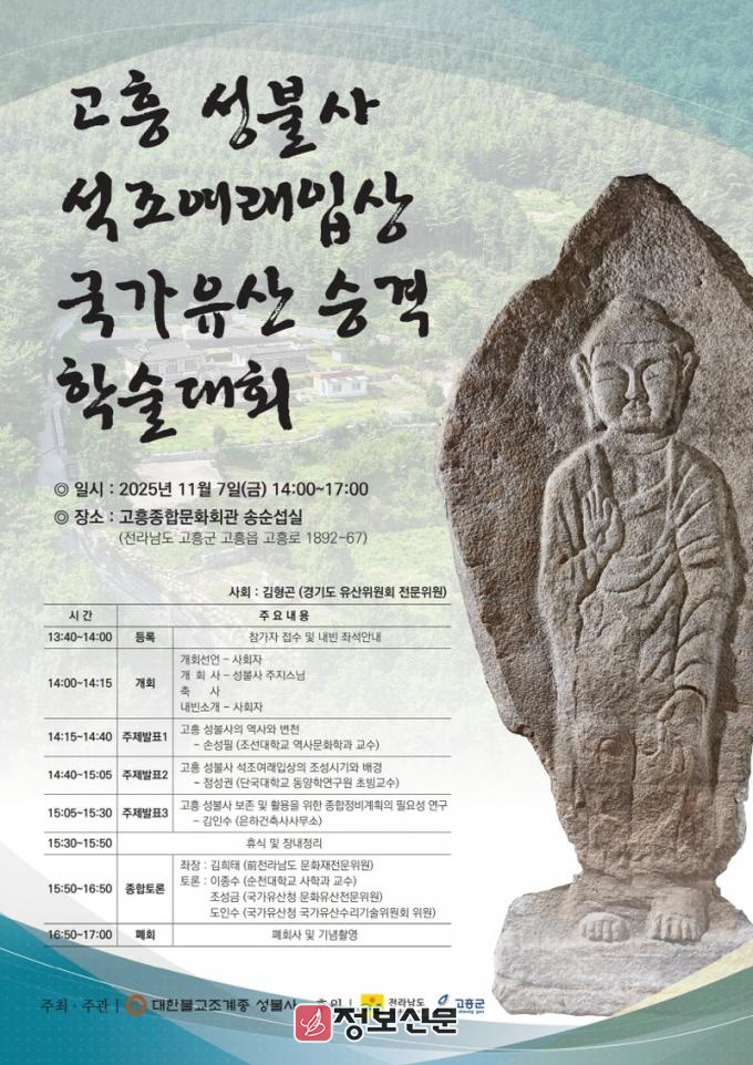 이번 학술대회는 전라남도와 고흥군이 주최하고, 대한불교조계종 성불사와 청람문화유산연구원이 주관해 진행할 예정이다. 전라남도 유형문화유산 제250호인 ‘고흥 성불사 석조여래입상’의 국가유산적 가치를 재평가하고, 성불사(주지 지암스님)를 비롯한 고흥 지역 불교문화유산의 역사적 의미를 재조명하기 위해 마련됐다.