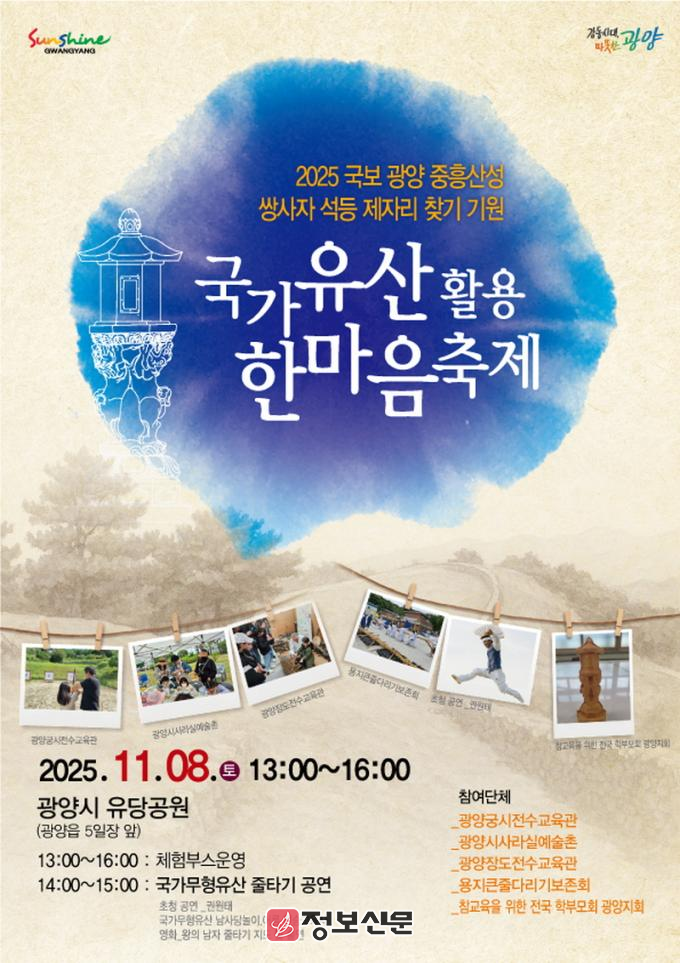행사장에는 국보 중흥산성 쌍사자 석등의 역사와 의미를 알리는 홍보부스를 비롯해, 광양의 대표 국가유산 활용 프로그램이 전시·체험 형식으로 운영된다.