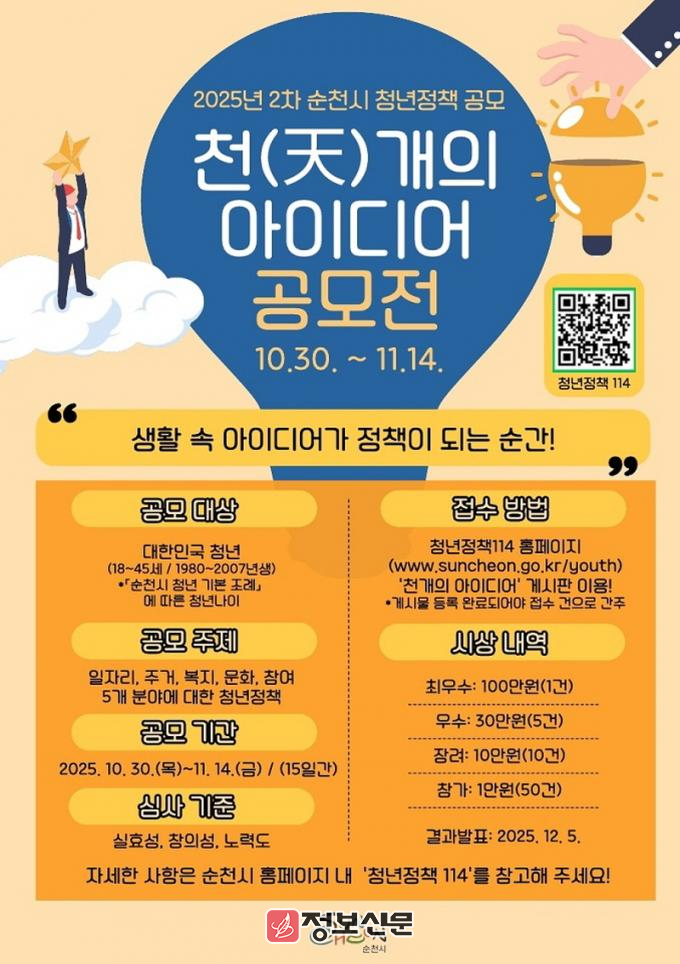 ![]() 순천시, 2025년 2차 청년정책 『천(天)개의 아이디어』 공모전 시작 |