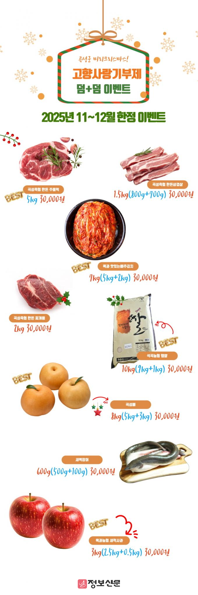 이번 행사는 11월부터 12월까지 한정 진행되며, 곡성 답례품몰의 인기 상품 22개 품목을 대상으로 최대 200% 이상 증량된 답례품을 제공한다.