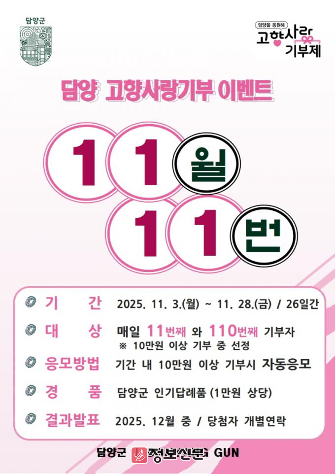 ![]() 담양군, 11월 고향사랑기부 이벤트 진행 |