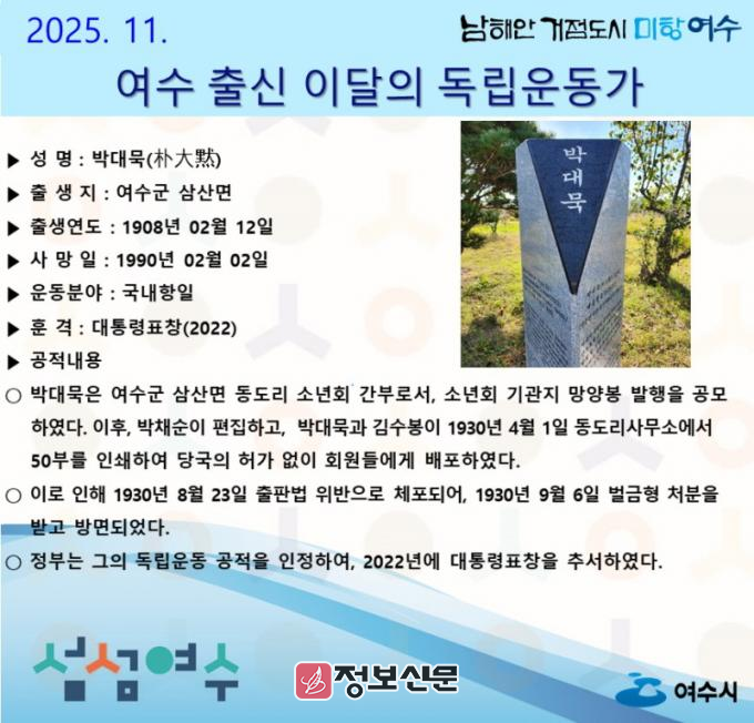 ![]() 여수시, 2025년 11월의 독립운동가 ‘박대묵(朴大黙)’ 선생 선정 |
