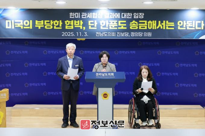 진보당.정의당 소속 전남도의원들은 이날 기자회견을 통해 ▲정부의 한미 관세 협상 협정문 및 관련 협약 내용 전면 공개 ▲국회의 협상 비준 동의 거부 ▲미국의 강압적 관세 협박 중단과 국제규범 준수를 강력히 요구했다.