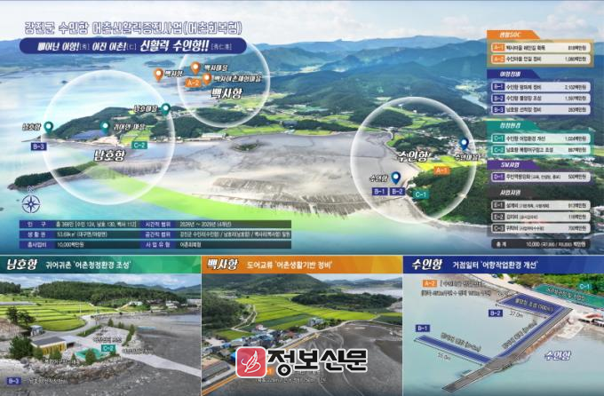 2026년 강진군 수인항 어촌신활력증진사업은 향후 4년간 국비 70억원을 포함한 총 100억원의 사업비가 투입된다. 배후마을의 생활여건개선을 위한 기초생활인프라 정비, 방파제와 물양장 등 어항시설 정비를 통한 안전한 어항시설 구축, 어구보관장과 작업공간 마련을 통한 깨끗하고 쾌적한 어업환경 조성을 목표로 추진될 예정이다.