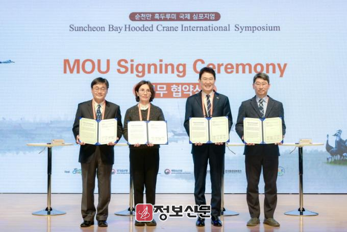 ![]() 지난 5일 순천시·국제두루미재단·한국조류학회·한국물새네트워크 간 흑두루미 서식지 보전을 위한 4자 업무협약을 체결하고 기념사진을 촬영하고 있다 (좌측부터 한국물새네트워크 대표 이기섭, 국제두루미재단 아시아담당자 위치엔, 순천시 시장 노관규, (사)한국조류학회 회장 박진영)