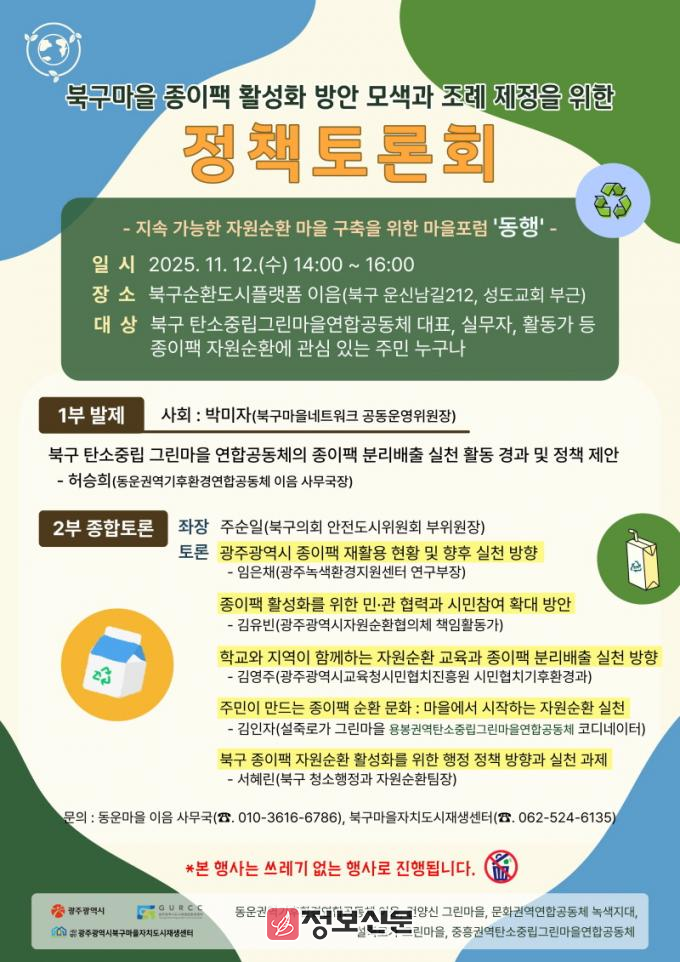 이번 정책토론회는 2024~2025년 북구 탄소중립 공공의제인 ‘종이팩 올바르게 분리배출하기’의 성과를 공유하고, 민·관·정이 협력하여 종이팩 자원순환이 제도적으로 정착될 수 있도록 구체적인 방안을 논의하기 위해 마련됐다.