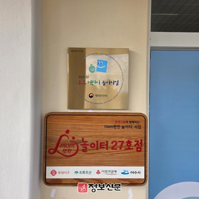 ![]() ▲ 여수시 mom편한 공공형 실내놀이터 ‘2025년 우수어린이놀이시설’ 현판 |