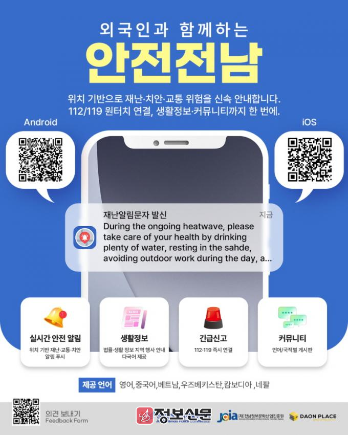 전남에 체류하는 외국인은 치안·교통·날씨·환율 등 생활안전에 필요한 유용한 정보를 재난·안전문자와 함께 다국어로 확인하고 커뮤니티 게시판에서 국가별 언어로 소통할 수 있다. 외국인 스스로가 지역 안전의 주체로 참여할 수 있는 환경이 만들어진 셈이다.