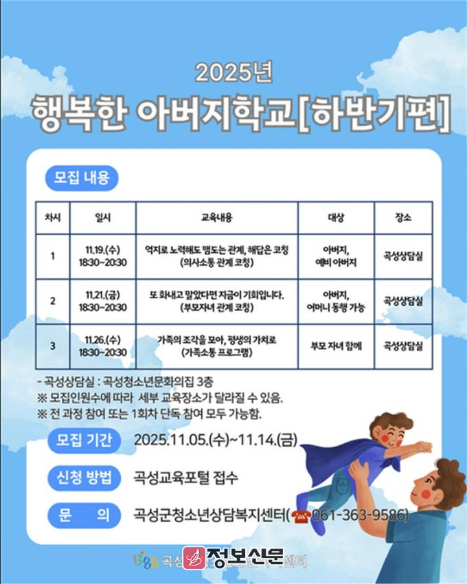 ![]() 곡성군청소년상담복지센터, 행복한 아버지학교 10기[하반기편]참가자 모집 |