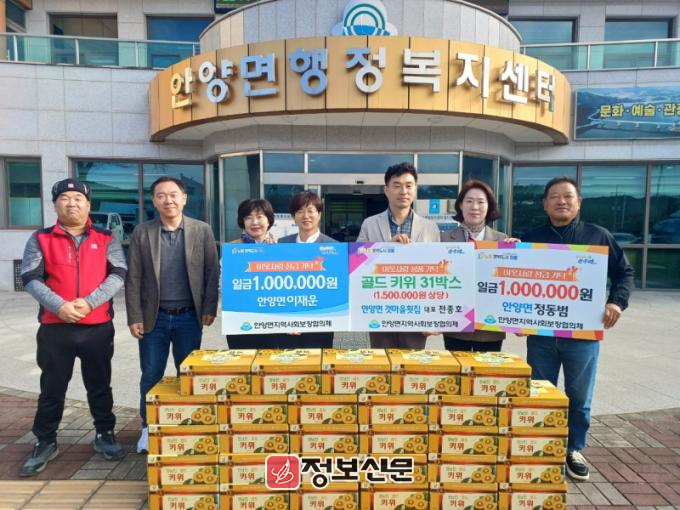 이날 안양면 갯마을횟집(대표 전종호)에서는 150만원 상당의 물품(골드키위 31박스)을, 안양면 정동범 씨와 이재운 씨는 각각 100만원의 성금을 전달했다.