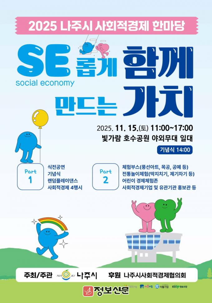 나주시(시장 윤병태)는 오는 15일 빛가람동 호수공원 중앙무대에서 ‘2025 사회적경제 한마당’을 연다고 11일 밝혔다.