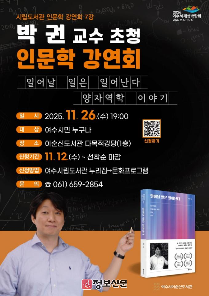 ![]() 여수시, 박권 교수 초청 인문학 강연회 11월 26일 개최 |