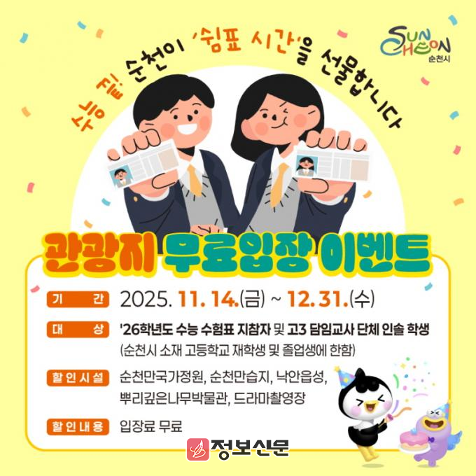 ![]() 순천시, 수험생 관광지 무료입장 이벤트 진행 |