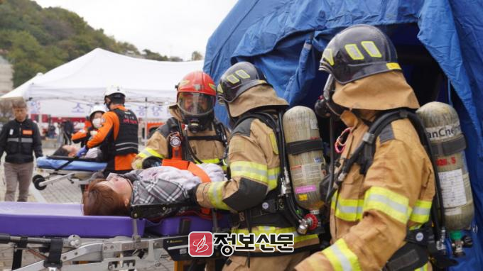 소방청과 전남도소방본부는 이날 규모 7.5의 지진으로 건물과 거북선대교가 붕괴되고, 선박 화재와 산불 등 동시다발적 화재와 폭발이 발생하는 복합 재난 상황을 가정해 실전과 같은 훈련을 펼쳤다.