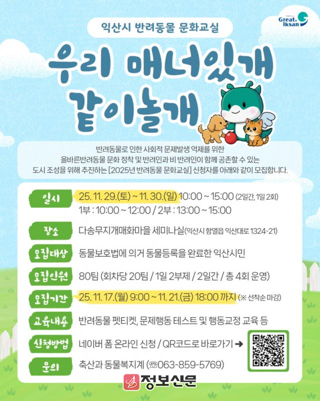 익산시는 오는 29~30일 함열 다송무지개 매화마을에서 '반려동물 문화교실'을 열고, 반려동물 이론 교육과 실습을 진행한다고 13일 밝혔다. 이번 교육은 사람과 동물이 함께 어울리는 사회 분위기를 조성하고, 성숙한 반려동물 인식과 예절 확산을 위해 마련됐다.