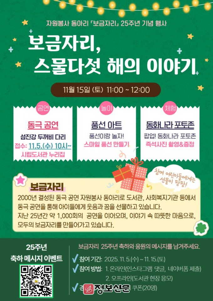 또한, ‘보금자리’ 결성 25주년「축하메시지 이벤트」도 함께 진행된다. 응원과 축하의 메시지를 남긴 시민 중 추첨을 통해 소정의 선물을 증정할 예정이다.