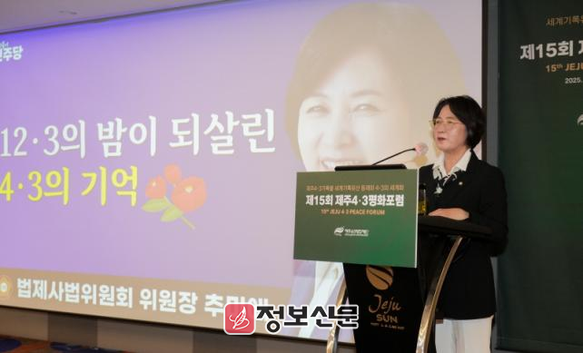 추미애 위원장은 ‘제주4·3 진실규명의 의미’를 주제로, “제주 4·3 해결의 가장 큰 걸림돌은 오랜 세월 이어진 색깔론이었다”며, “4·3에 씌워진 낙인 프레임을 ‘연대의 힘’으로 넘어섰다”고 강조했다. 또한 “제주4·3의 진실을 지키고, 그 교훈을 다음 세대에 전하며 다시는 국가폭력이 시민을 짓밟는 일이 없어야 한다”고 말했다.