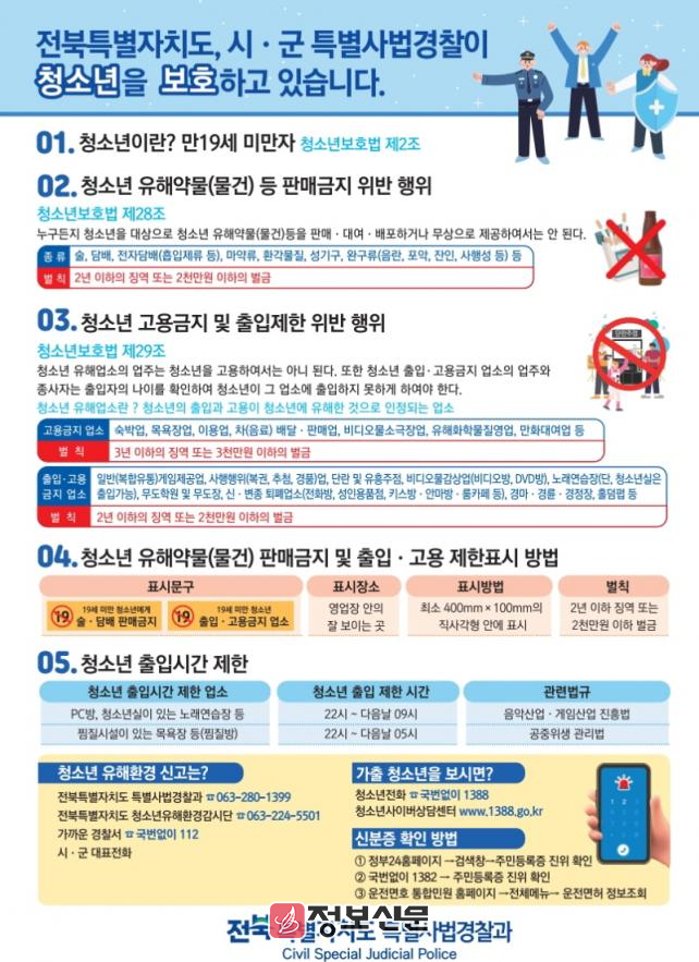 오택림 전북특별자치도 도민안전실장은 “청소년들이 안전하고 건강하게 성장할 수 있는 환경을 만드는 것이 무엇보다 중요하다”며 “업소에서도 신분증 확인 등 기본수칙을 철저히 준수해 청소년 보호에 적극 동참해 달라”고 당부했다.