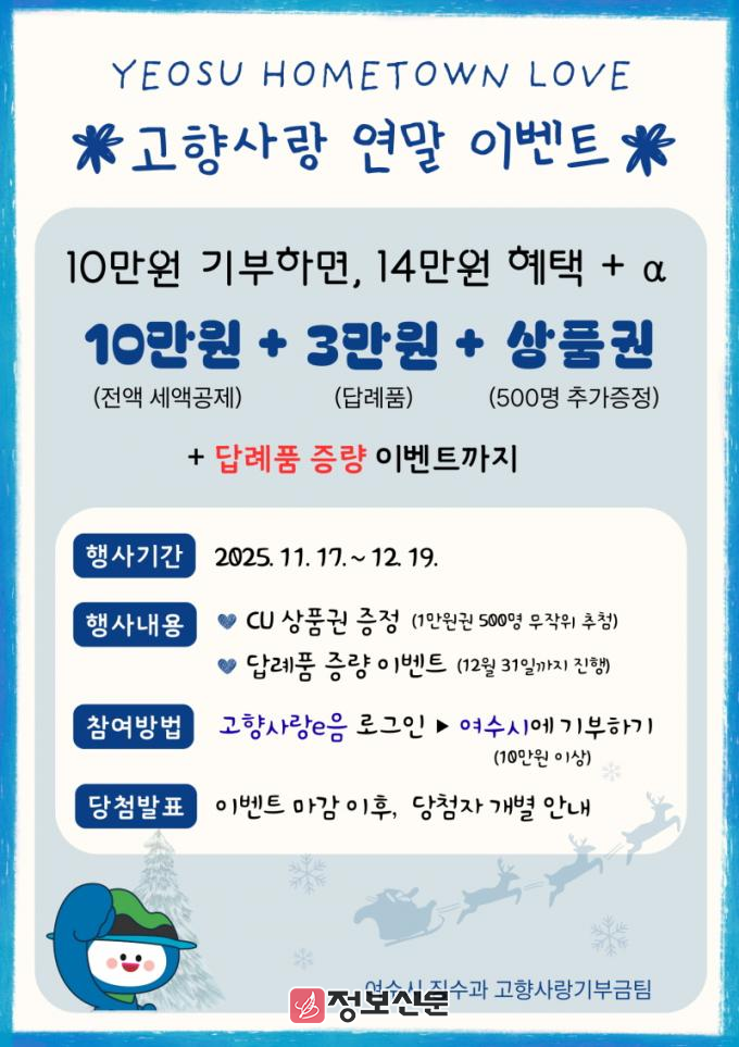 ![]() 여수시, 고향사랑기부제 연말 이벤트 진행 |
