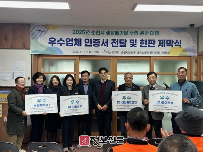 ![]() 순천시, 2025년 생활폐기물 수집·운반 대행 평가 우수업체 인증서 전달식 개최 |