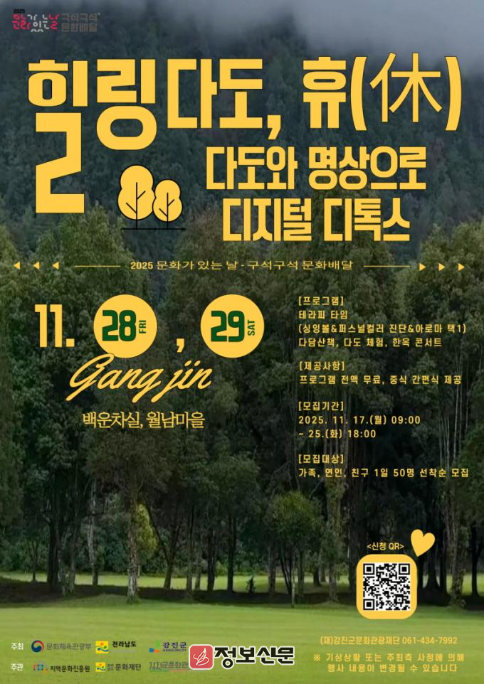 모집은 일별 선착순 50명으로 11월 17일(월) 오전 9시부터 신청 가능하며, 자세한 내용은 강진군문화관광재단 공식 SNS에서 확인할 수 있다.