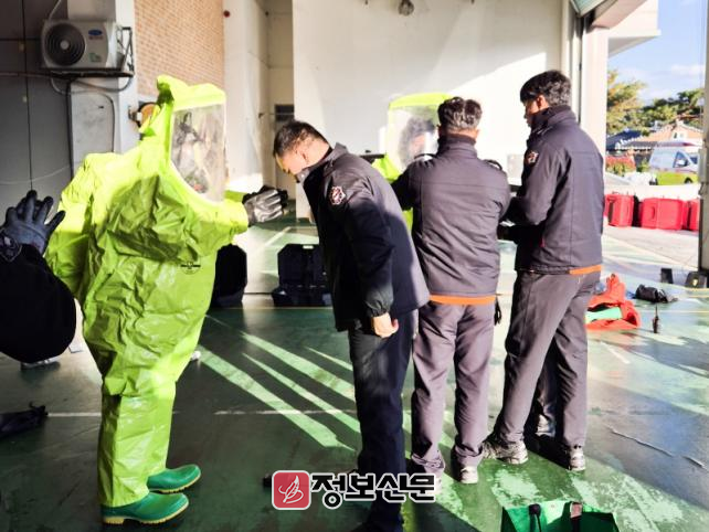이에 경찰, 소방, 보건 등 초동대응기관 간담회를 통해 생물테러 의심사건 신고 시 대응 절차와 초동조치 기관별 역할 등 상황대처방안에 대해 논의하며 협력체계를 구축하였으며, 이어서 보건소 초동대응요원을 대상으로 개인 보호복(Level A)의 착·탈의 방법과 공기호흡기 사용법 등 실습 교육을 실시해 현장대응능력을 강화했다.