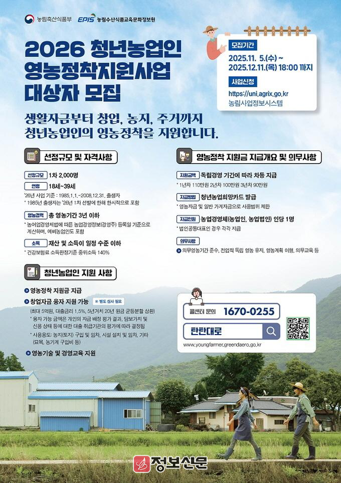 이와 더불어 농지 구입·임차, 시설 설치 등 영농 창업자금 융자지원도 별도 심사를 통해 제공되며, 영농 기술과 경영 역량 강화를 위한 교육 프로그램도 함께 지원해 안정적인 영농 기반 구축을 돕는다.신청은 농림사업정보시스템(uni.agrix.go.kr)에서 온라인으로 할 수 있으며, 서류 심사와 면접 평가를 거쳐 내년 1월 최종 대상자가 확정된다.
