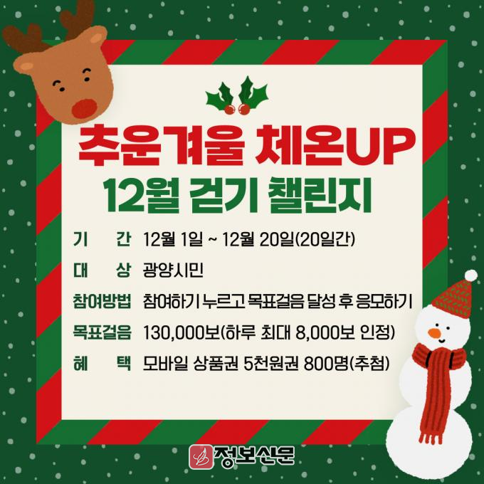 ![]() 광양시, 워크온 ‘추운겨울 체온UP 12월 걷기 챌린지’ 운영 |