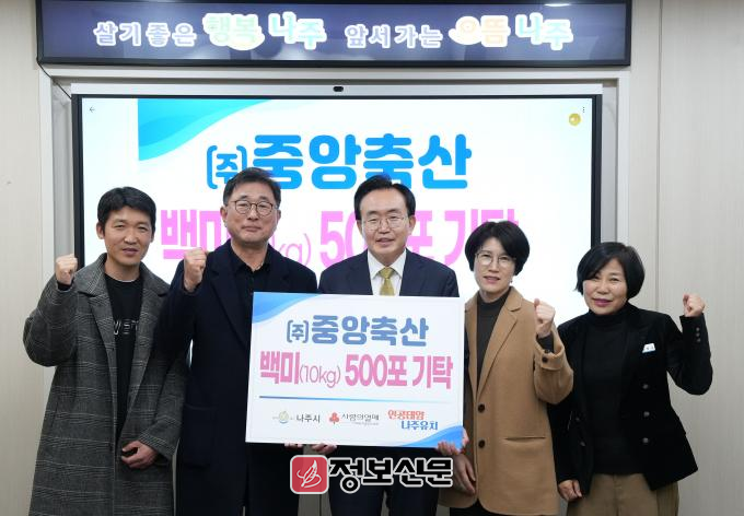 나주시(시장 윤병태)는 지난 20일 ㈜중앙축산(대표 신동규)이 10kg 백미 500포를 기탁했다고 21일 밝혔다.