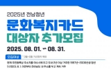 여수 김금덕 기자2025. 08.04[정보신문 = 김금덕 기자] 여수시(시장 정기명)는 ‘2025년 전남청년 문화복지카드 지원사업’ 대상자를 8월 한 달간 추가 모집한다. ‘전남청년 문화복지카드 지원사업’은 지역 청년에게 연간 25만 원의 문화복지비를 지원해 문화 향유 기회를 확대하기 위한 사업으로, 2022년부터 시행되고 있다. 여수시는 올해 상반기 16,649명의 청년을 대상자로 선정했으며, 이번 추가 모집을 통해 상반기에 신청하지 못한 청년 2,203명을 추가로 선정할 계획이다. 신청 대상은 2023년 8월 1일 이전부터 전남 도내에 2년 이상...