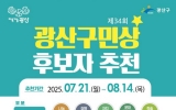 남구 김금덕 기자2025. 07.22[정보신문 = 김금덕 기자] 광주시 광산구(구청장 박병규)가 지역사회 발전, 상생공동체 실현에 앞장선 제34회 ‘광산구민상’ 후보자를 공모한다. △나눔‧봉사 △효행‧복지 △자치공동체 △문화‧예술‧체육 △학술‧교육 △지역경제 △노사상생 △산업기술 △인권증진 △안전‧환경까지 총 10개 부문에서 공적을 세운 시민 등에게 상을 수여한다. 광산구에서 태어났거나 3년 이상 살고 있는 주민, 공고일 기준 3년 이상 사업장 소재지가 광산구인 직장에 다니거나 활동 실적이 있...