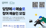 담양 김금덕 기자2025. 06.23[정보신문 = 김금덕 기자] (재)담양군문화재단(이사장 정철원, 이하 재단)은 프로그램에 참여할 담양 예술인을 모집한다. 올해로 2회째 진행하는 이번 프로그램은 예술인의 홍보역량을 지원하는 동시에 각 장르별 예술인 간 네트워크와 협업을 더욱 확장하는데 중점을 두고 있으며, 예술인 프로필 사진 및 영상 제작을 지원한다. 촬영은 스튜디오 및 개인 작업공간 등에서 진행되며, 예술인의 활동 이력과 작품소개, 예술적 가치를 드러낼 수 있도록 인터뷰 또한 진행할 계획이다. 참여신청은 6월 23일부터 6월 30일까지 공고...