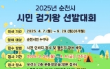 순천 김금덕 기자2025. 03.21[정보신문 = 김금덕 기자] 순천시(시장 노관규)는 생활 속 걷기를 활성화하기 위해 4월부터 9월까지 6개월 동안 모바일 걷기 앱 워크온을 활용한 ‘시민 걷기왕 선발대회’를 진행한다고 밝혔다. 이번 대회에서는 100명의 걷기왕을 선정할 예정이며, 선정 기준은 1일 만보 제한으로 매월 10일 이상 걷고, 6개월 동안 120만보 이상 걷기와 함께 체지방 3kg 이상 감소하는 것이다. 선정된 시민에게는 순천사랑상품권 3만원이 지급된다. 참여를 원하는 시민은 핸드폰 앱인 워크온에서 순천시 커뮤니티에 가입하고, 3월 24일부터 ...