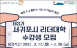 서귀포시 김금덕 기자2025. 03.16[정보신문 = 김금덕 기자] 서귀포시는 3월 17일부터 28일까지 시민 자치의식과 리더십 강화를 위한 「제3기 서귀포시 리더대학」 수강생을 모집한다. 서귀포시 리더대학은 ‘주민자치학과’와 ‘양성평등학과’의 전공과정 및 시민공개강좌(상·하반기)로 구성되며, 시민들이 지역사회 리더로 성장할 수 있도록 지원하는 평생교육 과정이다. 서귀포시는 기존에 개별적으로 운영하던 리더대학(주민자치학교)·시민대학·여성대학을 2024년부터 통합 운영하여 교육과 운영의 효율성을 높였다. 통합 2년차를 맞이하는 올해는 참여형 교육과 현장 학습을 ...