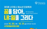 서귀포시 김금덕 기자2025. 10.23[정보신문 = 김금덕 기자] 서귀포시, 서귀포시교육지원청(교육장 김지혜), (재)서귀포시교육발전기금(이사장 김문수) 공동주최로 10월 30일(목)부터 10월 31일(금)까지 서귀포예술의전당 일원에서 지역 청소년들의 진로 탐색을 지원하는 ‘제5회 서귀포시 청소년 진로축제(부제: 꿈을 담아, 내:일을 그리다)’ 를 개최한다. 이번 진로축제는 청소년들이 자신의 꿈을 담아 내:일을 그리는 진로체험부스(탐색+체험), 진로특강, 직업인 멘토상담, 학생 동아리 공연과 작품 전시 등 다채로운 프로그램을 통해 청소년에게 주도적으로 미래를 설계...