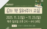 광주 정보신문2025. 10.21[정보신문 = 김금덕 기자] 동녘도서관(분관장 진승미)은 다음 달 2일부터 23일까지 평생교육실에서‘2025년 제6차 책 읽어주기 교실’을 운영한다. 이번 프로그램은 유아 및 초등 저학년 어린이의 독서 흥미 증진과 창의력 향상을 위해 마련되었으며 매주 일요일 오후 2시부터 4시까지 총 4회에 걸쳐 진행된다. 김미영 독서지도 및 책놀이 전문가의 지도 아래 ‘바빠요 바빠’, ‘여자 놀이 남자 놀이?’, ‘우리 같이 놀자’, ‘슈퍼고양이’, ‘막대기 아빠’ 등 다양한 그림책을 함께 읽고 이야기 확장 놀이와 만들기 등 독후활동을...