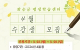 화순 남재옥 기자2026. 03.23[정보신문 = 남재옥 기자] 화순군(군수 구복규)은 지역 주민의 평생학습 참여 확대와 학습 접근성 향상을 위해 4월 운영되는 평생학습 프로그램 참여자를 모집한다고 밝혔다. 이번 4월 프로그램은 원데이 클래스 형태로 ▲마크라메 목공예 ▲감태 에너지바 만들기 등 총 2개 과정으로 운영된다. 프로그램은 화순 어울림센터 내 평생학습센터에서 진행되며, 모집 인원은 19세 이상 화순군민 36명이다. 교육비는 무료이다. 수강 신청은 3월 23일부터 29일까지 화순군 평생학습관 홈페이지를 통해 온라인으로 접수할 수 있다. 선착순으...